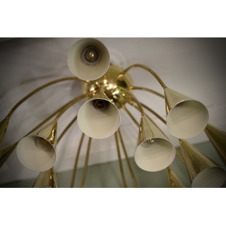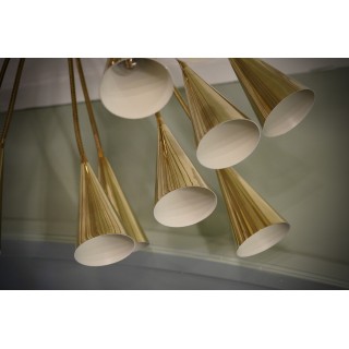 Il lampadario ha la forma di un mezzo "sputnik", composto da una semisfera centrale in ottone sulla quale sono alloggiati tubi pieghevoli in ottone all'estremità dei quali portano un cono in ottone. I piccoli tubi di ottone sono come le braccia di un polipo, possono essere spostati a seconda di come una persona vuole la luce. Ha sedici luci. Internamente i coni, dove sono alloggiati i bulbi, sono verniciati di bianco. Semplice ma molto elegante. Misure ( diametro 90, H 60 ). Inches ( diameter 35, H 24 ).