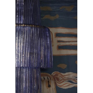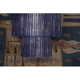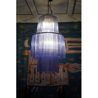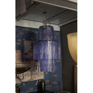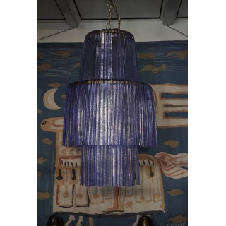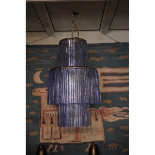 The all-iron structure is formed by three large circles of different sizes. These large Murano glass hairpins of periwinkle color hang from these circles. The central circle is the largest in diameter, while the top and bottom circles have a smaller diameter. Internally there are 9 light points, so it is very bright. In the lower part there is a back cover.