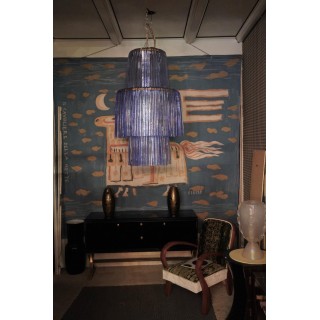 Lampadario di Murano dal raro color pervinca. E' composto da tre piani due più piccoli e uno centrale di diametro 80 cm. La struttura è in ferro verniciato color oro. E' un lampadario molto luminoso con nove lampadine attacco grande. Epoca 1950. Cm ( diametro 80, H 130). Inches ( diameter 31, H51).