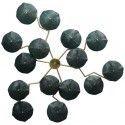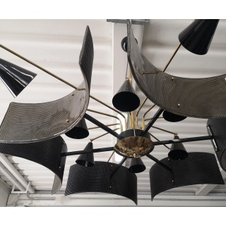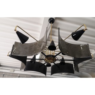 The structure of the chandelier is in brass, while the large plates are in black Murano glass. Particularly the position of the lights, which are positioned in front of the glass, and then inside the structure. There are twelve bulbs that illuminate the chandelier, six external and six internal.