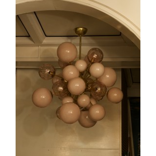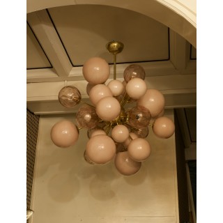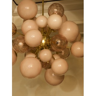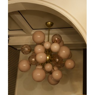 Something really incredible this Murano chandelier. As on a photograph of an infinitesimal instant after the explosion of a star, in fact the way the spheres are positioned asymmetrically gives this impression. The pastel pink Murano glass spheres are attached to a central metal sphere by fine brass arms.