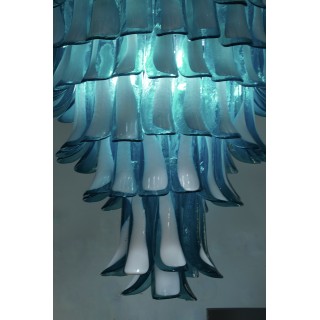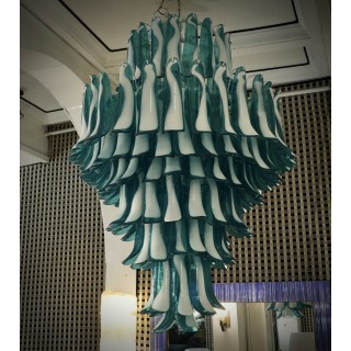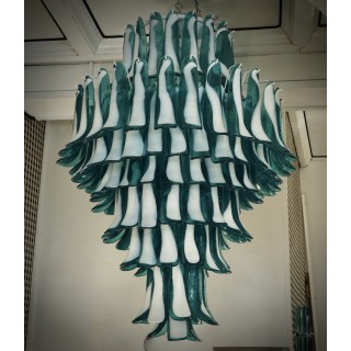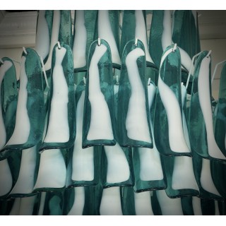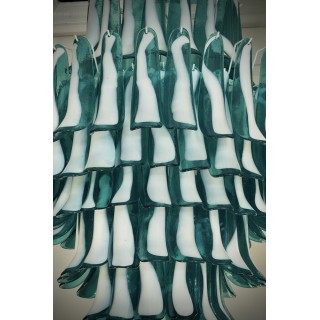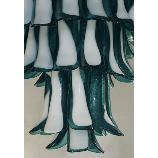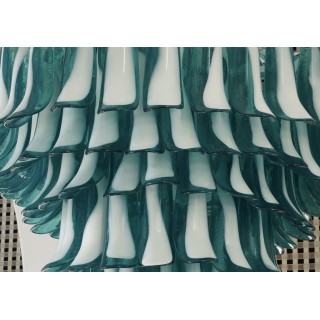 Il lampadario ha una struttura rotonda in metallo bianco. Tutt'intorno piastrelle in vetro di Murano color smeraldo e bianco. Ci sono otto cerchi concentrici, che si allargano sempre di più dal basso fino all'ultimo cerchio in alto. Poi ancora l'ultimo cerchio si restringe per coprire il gancio a soffitto, così da essere fissato direttamente al soffitto. Ci sono dodici lampadine su più livelli. Misure Cm ( diametro 90, H 120). Inches ( diameter 35, H 47).