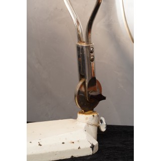The lamp is made up of a series of pieces of different metals. A white metal base, from which a double arm unfolds, adjustable in inclination, which leads to the hat where the light bulb is positioned. As you can see from the photo, there is a filter that can also give a blue light. Misure ( 23 x 35, H 55 ). Inches ( 9 x 14, H 22 ).