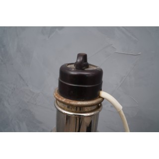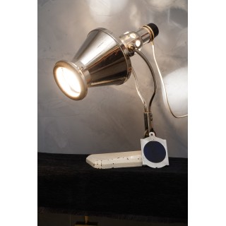 La lampada è composta da una serie di pezzi di metalli diversi. Una base in metallo bianco, da cui si dipana un doppio braccio, regolabile nell'inclinazione, che conduce al cappello dove è posizionata la lampadina. Come potete vedere dalla foto, è presente un filtro che può dare anche una luce blu. Misure ( 23 x 35, H 55 ). Inches ( 9 x 14, H 22 ).