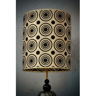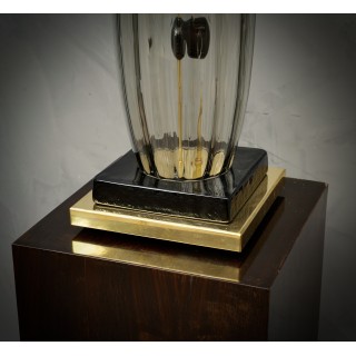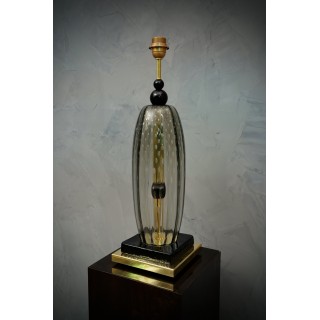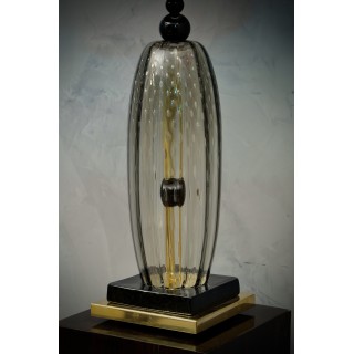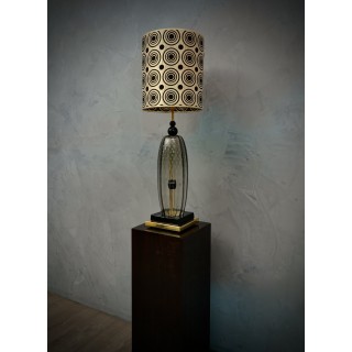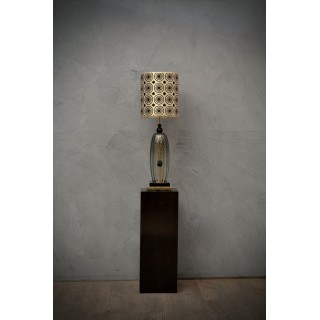 Tutto in vetro soffiato di Murano, colore nero e trasparente. Formata da una sfera centrale allungata in colore trasparente e da una doppia base quadrata in vetro nero e ottone, superiormente sono inserite due sfere e tubicini in vetro di Murano colore nero. Sopra è stato posizionato un paralume color crema con disegni geometrici neri. Si noti che all'interno della sfera allungata sono presenti una cannuccia di ottone e una piccola sfera di vetro nero. Misure Cm ( 20 x 20, H 92 ). Inches ( 8 x 8, H 36 ).