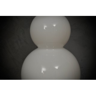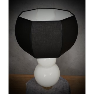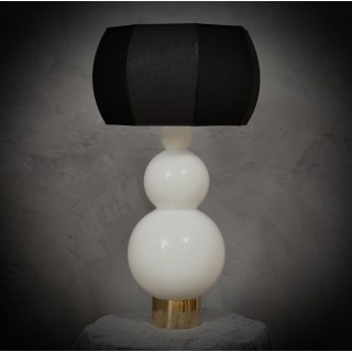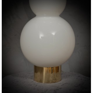 The lamp is composed of a rich cylindrical brass base on which the glass with its triple sphere shape rests. The white glass is very original because it is hand blown and has a shape of three superimposed spheres, the largest at the bottom and the two remaining smaller and smaller. At the top there is the light bulb and then the lampshade which has an octagonal but rounded shape, externally the lampshade is black while internally to better reflect the light it is white. From the base with a small hole extends the electric wire with which the lamp can then be turned on. Misure Cm ( diameter 35, H 65 ). Inches ( diameter 14, H 26 ).