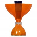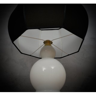La lampada è composta da una ricca base cilindrica in ottone su cui poggia il vetro con la sua forma a tripla sfera. Il vetro bianco è molto originale perché soffiato e ha una forma di tre sfere sovrapposte, la più grande in basso e le due rimanenti sempre più piccole. In alto c'è la lampadina e poi il paralume che ha una forma ottagonale ma tondeggiante, esternamente il paralume è nero mentre internamente per riflettere meglio la luce è bianco. Dalla base con un piccolo foro si estende il filo elettrico con il quale si può poi accendere la lampada. Misure Cm ( diameter 35, H 65 ). Inches ( diameter 14, H 26 ).