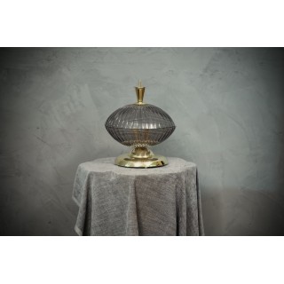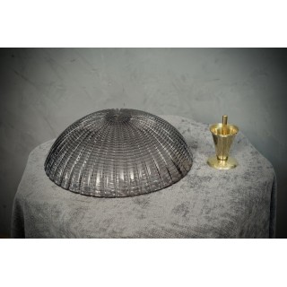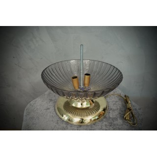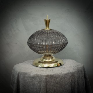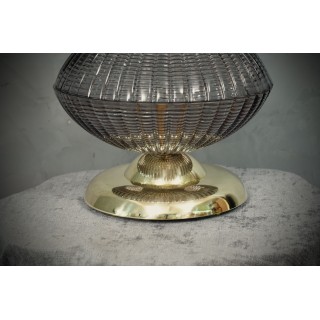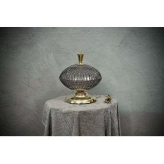 La lampada è composta da una base rotonda in ottone, sulla quale sono stati posizionati piviali in vetro di Murano; la prima coppa ha una particolare lavorazione del vetro realizzata interamente a coste, la seconda coppa è uguale alla prima solo che è posizionata capovolta rispetto alla prima. All'interno dei due vetri semisferici si trova il bulbo. Le lampade di Murano sono molto eleganti e hanno un loro gusto molto particolare, quando accese fanno una bella luce. Misure ( diametro 33, H 38 ). Inches ( diameter 13, H 15 ).