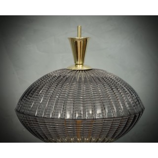 The lamp is composed of a round brass base, where cope in Murano glass have been positioned above; the first cup has a particular processing of the glass made entirely of ribs, the second cup is the same as the first only that it is positioned upside down compared to the first. Inside the two semi-spherical glasses there is the bulb. Murano lamps are very elegant and have their own very particular taste, when turned on they make a beautiful light. Misure ( diametro 33, H 38 ). Inches ( diameter 13, H 15 ).