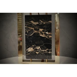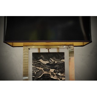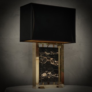 La lampada è formata da un'attualissima struttura rettangolare in ottone, alla quale è stato inserito nella parte centrale un pregiato marmo "portoro". Il marmo è centrale alla struttura e poggia su due piccole aste di ottone, in modo da lasciarlo rialzato nella parte inferiore. La struttura quadrata in ottone nella parte inferiore è stata arricchita con quattro piedini, che rendono la lampada ancora più stabile. Misure Cm ( 28 x 12, H 44 ). Inches ( 11 x 5, H 17 ).