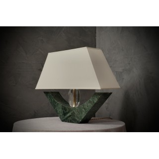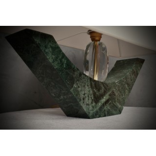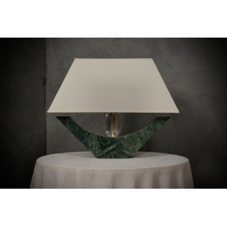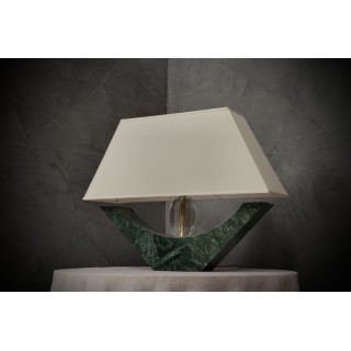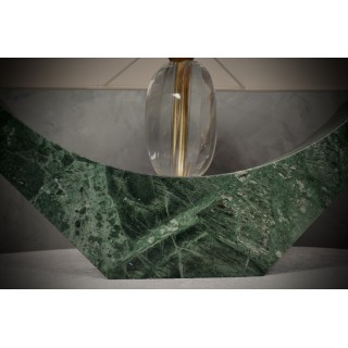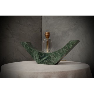 La lampada da tavolo è composta da una base in marmo "verde India"; La sua forma è molto bella e originale, che ricorda una gondola di Venezia. Il marmo ha una bellissima venatura, una gradazione che varia su più verdi fino al bianco. Sopra è stato inserito un pregiatissimo cristallo di Murano sfaccettato. Il portalampada era ancora posizionato sopra il cristallo, su cui poi poggia il paralume. La forma di quest'ultima è ripresa dalla forma della lampada come si può vedere dalle foto. Misure, Cm ( 58 x 10, H 28 ). Inches ( 23 x 4, H 11 ).