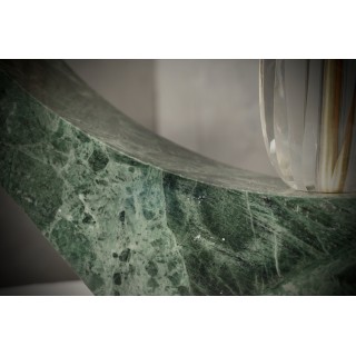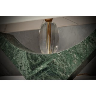 The table lamp is made up of a "green India" marble base; Its shape is very beautiful and original, which looks like a gondola in Venice. The marble has a beautiful veining, a gradation that varies on more greens up to white. A very precious multi-faceted Murano crystal has been inserted above. The lamp holder was still positioned above the crystal, on which the lampshade then rests. The shape of the latter is taken from the shape of the lamp as can be seen from the photos. The lamps were custom made for our HannauRoma shop in a one-off limited edition of two. Misure, Cm ( 58 x 10, H 28 ). Inches ( 23 x 4, H 11 ).