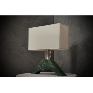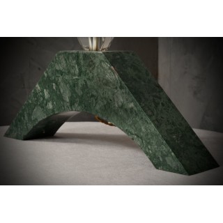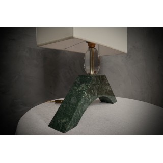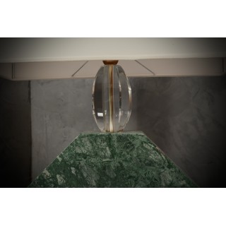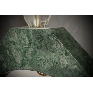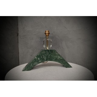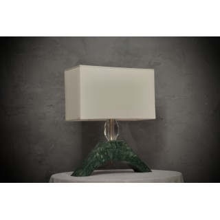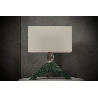 La lampada da tavolo è composta da una base in marmo "verde India"; La sua forma è molto bella e originale, che sembra un ponte. Il marmo ha una bellissima venatura, una gradazione che varia su più verdi fino al bianco. Sopra è stato inserito un pregiatissimo cristallo di Murano sfaccettato. Il portalampada era ancora posizionato sopra il cristallo, su cui poi poggia il paralume. La forma di quest'ultima è ripresa dalla forma della lampada come si può vedere dalle foto. Misure Cm ( 50 x 10, H 37 ). Inches ( 20 x 4, H 14 )