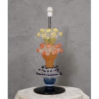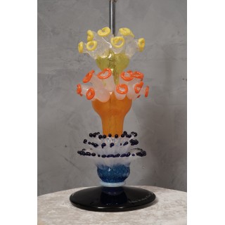 The table lamp is made up of four distinct parts; starting from the bottom we can see a beautiful black glass plate with a transparent edge (where you can see the signature), then a blue and white glass with stamens was placed immediately above it, again above an orange glass with very particular little flowers, and finally a yellow glass with the same flowers. The lamp has a very special and eye-catching design.
