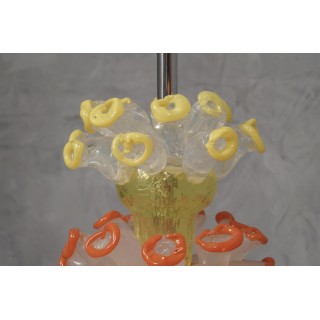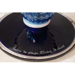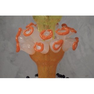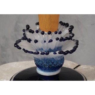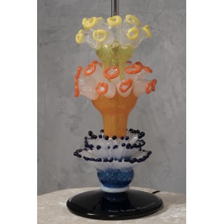 La lampada da tavolo è composta da quattro parti distinte; partendo dal basso si vede una bella lastra di vetro nero con bordo trasparente (dove si vede la firma), poi subito sopra è stato posto un bicchiere blu e bianco con stami, sempre sopra un bicchiere arancione con fiorellini molto particolari, e infine un bicchiere giallo con gli stessi fiori. La lampada ha un design molto particolare e accattivante. Misure ( diametro 26, H 69 ). Inches ( diameter 10, H 27 ).