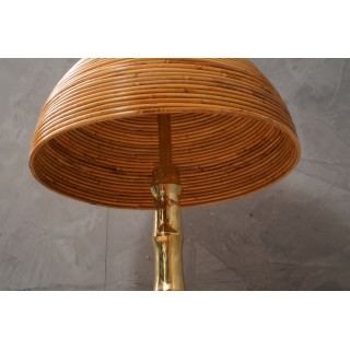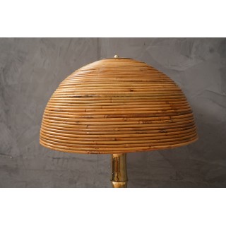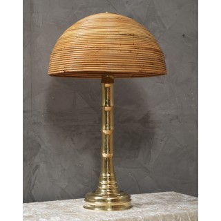 La lampada è composta da un bellissimo stelo in ottone sagomato e da una base in ottone. Sopra c'è un grande paralume in bambù. Il bambù è posizionato in modo da formare cerchi concentrici uno sopra l'altro. Sotto il paralume si trovano due portalampade che portano due piccole lampadine. Raffinatezza e classe come è nello stile dell'ultimo mezzo secolo italiano, pezzi unici nel loro genere che rimangono sempre preziosi. Quando è accesa, la lampada è molto luminosa e illuminerà perfettamente la tua scrivania. Misure ( diametro 49, H 63 ). Inches ( diameter 19, H 25 ).