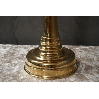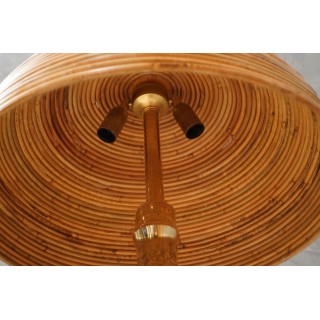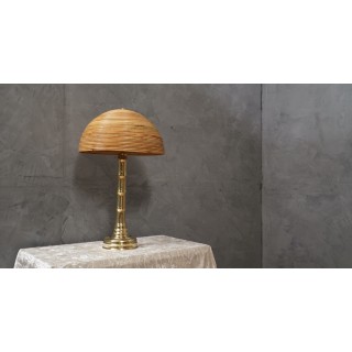 The table lamp is composed of a beautiful shaped brass stem and an equally brass base. Above is a large bamboo lampshade. The bamboo is positioned to form concentric circles on top of each other. Under the lampshade are two lamp holders which carry two small bulbs.Refinement and class as it is in the style of the last half century, unique pieces of their kind that always remain precious. When turned on, the lamp is very bright and will illuminate your desk perfectly. Misure ( diametro 49, H 63 ). Inches ( diameter 19, H 25 ).