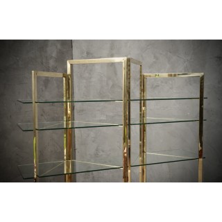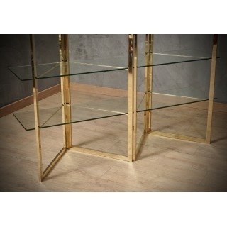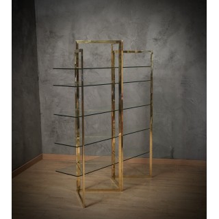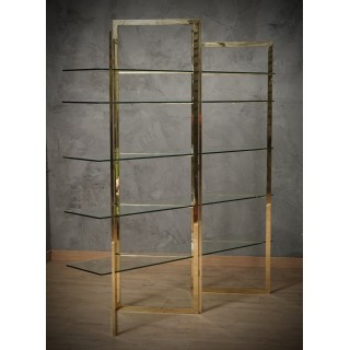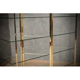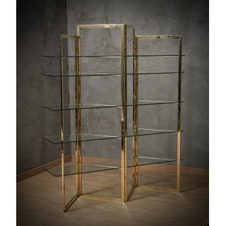 Splendida libreria con movimento a fisarmonica in ottone con ripiani in vetro molato. Design semplice e lineare per Sandro Petti.