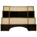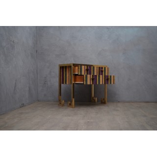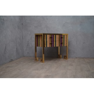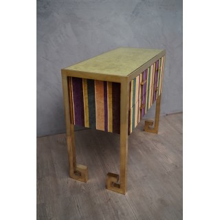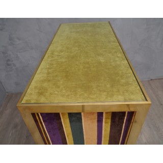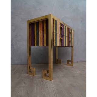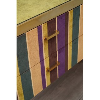 Comò a due cassetti, ispirato allo stile Art Decò, è studiato e creato per l'atelier HannauRoma, in cui il deposito è specializzato. Ha una struttura tutta in ottone mentre il corpo è ricoperto con un velluto di seta. Il piano è rivestito in velluto verde e protetto da un piano in vetro, i fianchi ed i lati invece sono rivestiti in velluto a strisce di più colori abbinato. Cm (101 x 47, H 85).