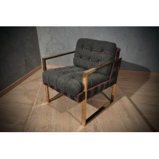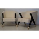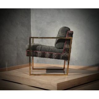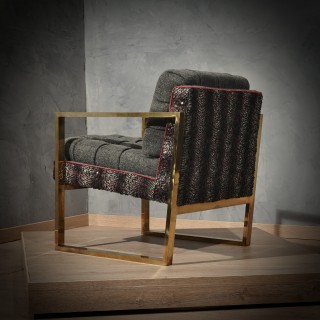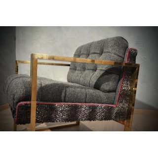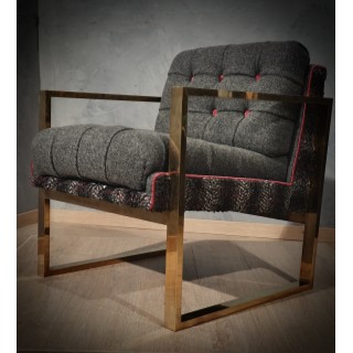 Coppia di poltrone realizzate dai nostri architetti, in ottone e tessuti ricercati delle seterie di Zoagli. La forma geometrica dell'ottone contrasta con la forma morbida dell’imbottitura. I particolari tessuti usati fanno di queste poltrone due piccole opere d’arte. Da notare la seduta leggermente reclinata per permettere un totale relax. Cm ( 65 x 66, H 80). Inches (25.6 x 26, H 31).