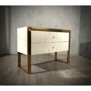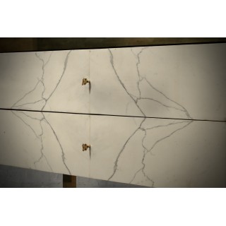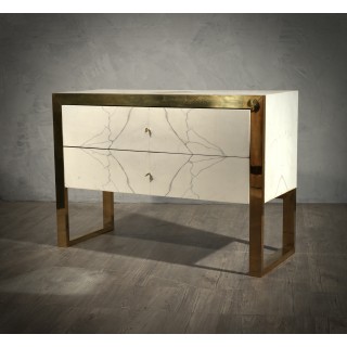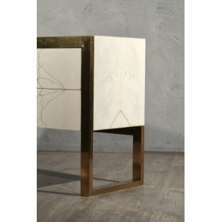 Comò in marmo bianco Carrara Statuario con struttura in ottone lucido. Questo comò ha un aspetto molto lussuoso, dovuto all'uso di materiali non comuni, marmo di Carrara Statuario e ottone.