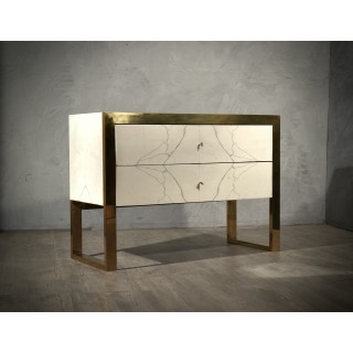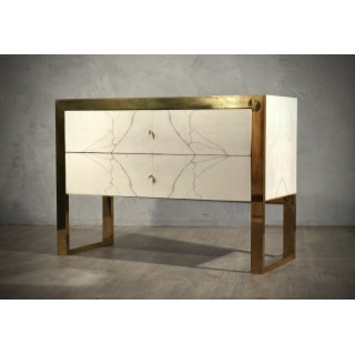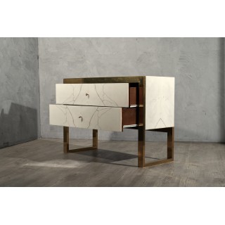 Il comò è composto da due grandi cassetti in legno rivestiti in marmo bianco e una chiave in ottone centrale ne consente l'apertura. Il corpo interamente in legno placcato in marmo è squadrato. Una cornice in ottone corre lungo tutto il bordo anteriore del cassetto e si alza sotto diventando una gamba che rialza il cassettone da terra. Il cassettone ha un intarsio di marmo di alabastro leggermente più giallo del colore di tutto il cassettone, circondato da marmo rosso. Notare l'elegante vena grigia che si staglia contro il marmo bianco. Le lastre di marmo sono state aperte per formare proprio un disegno con venature. Un lavoro manuale quasi perso ora della vecchia scuola artigianale. Creato per un nuovo progetto.