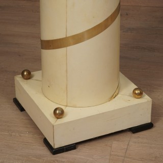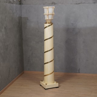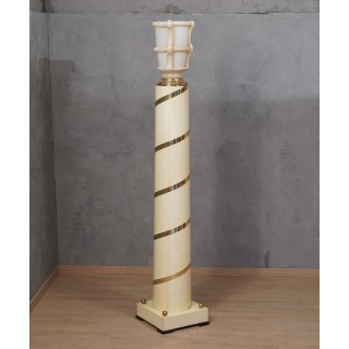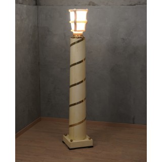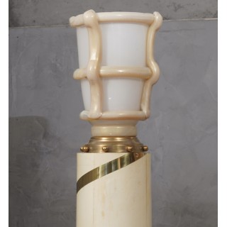 La colonna dalla struttura cilindrica ma leggermente conica è in legno ed è completamente rivestita in pergamena; una fascia di ottoni corre dal basso verso l'alto, girando tutto intorno alla colonna. In alto un grande vaso di Murano in pasta vitrea bianca e crema ne segnala la presenza. La colonna è posta su una base quadrata rivestita anch'essa in pergamena con quattro ciabatte in legno laccato nero, e quattro sfere di ottone poste sulla sommità. La lampada da terra ricorda un vecchio lampione di un antico villaggio italiano. Misure ( 40 x 40, H 228 ) Inches ( 16 x 16, H 90 ).