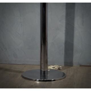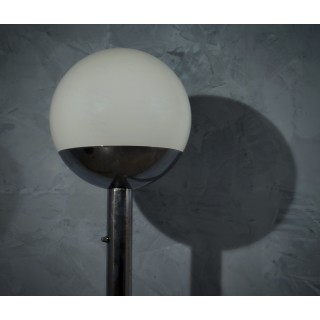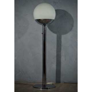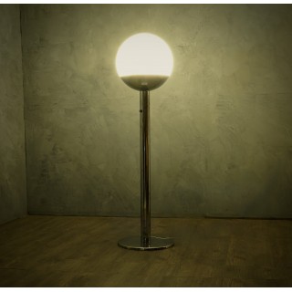 The lamp is composed of a large central stem in chromed steel that starts from a large plate as a base. Above to accommodate the large white glass sphere, there is a goblet also in chromed steel. In the center of the stem there is the switch to turn the lamp on and off. Inside the sphere, easily removable, there are three light connections. Cm ( dia 46, H 168). Inches (dia 18, H66).