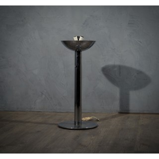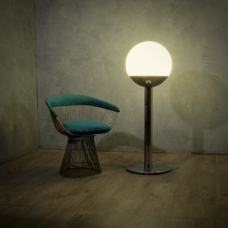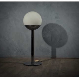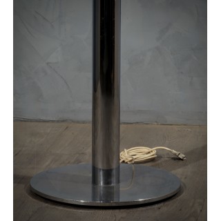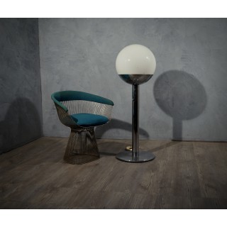 The lamp is composed of a large central stem in chromed steel that starts from a large plate as a base. Above to accommodate the large white glass sphere, there is a goblet also in chromed steel. In the center of the stem there is the switch to turn the lamp on and off. Inside the sphere, easily removable, there are three light connections. Misure Cm ( diametro 46, H 127). Inches ( diameter 18, H 50).