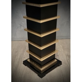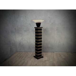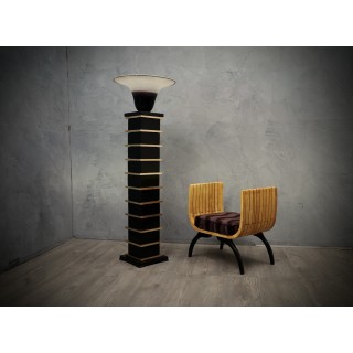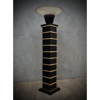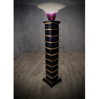 The floor lamps are made up of wooden modules lacquered with black shellac, interspersed with polished brass profiles. Above is a large Murano glass bowl, signed Barbini Murano, black / dark purple in color, with white etched edge. The wiring is made up of a single bulb. Misure Cm ( 30 x 30, H 154). Inches ( 12 x 12, H 60).