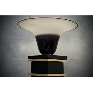 Le lampade da terra sono composte da moduli in legno laccati con gommalacca nera, intervallati da profili in ottone lucido. Sopra c'è una grande coppa in vetro di Murano, firmata Barbini Murano, di colore nero/porpora scuro, con bordo bianco inciso. Il cablaggio è composto da un'unica lampadina. Misure Cm ( 30 x 30, H 154). Inches ( 12 x 12, H 60).