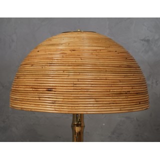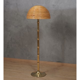 La lampada da terra è composta da un bellissimo stelo in ottone sagomato e da una base sempre in ottone. Sopra c'è un grande paralume in bambù. Il bambù è posizionato in modo che formino cerchi concentrici uno sopra l'altro. Sotto il paralume ci sono due portalampade che portano due piccole lampadine. Raffinatezza e classe come è stato lo stile dell'ultimo mezzo secolo, pezzi unici che rimangono sempre preziosi. Quando è accesa, la lampada da terra è molto luminosa e illuminerà perfettamente la tua scrivania. Misure ( diametro 58, H 172 ). Inches ( diameter 23, H 68 ).