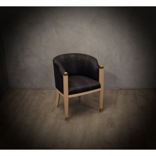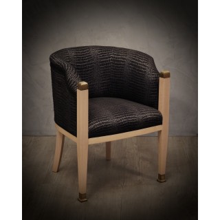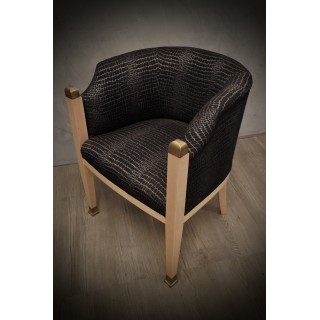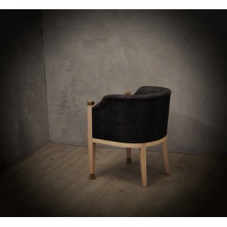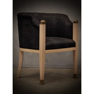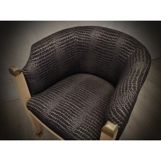 The armchairs have a maple structure; the wood has been bleached and then polished to give it a very light patina. The front legs have brass finishes both above and below the leg. The pair of armchairs has been re-upholstered with a rich black and silver fabric. The armchairs with their round backrest are very enveloping and comfortable, small in size and small, perfect for conversation or for the bedroom. Misure ( 61 x 61, H 77/44 ) Inches ( 24 x 24, H 30/17 ).