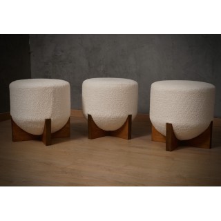 MidCentury Wood and White Bouclé Benches and Poufs, 1990