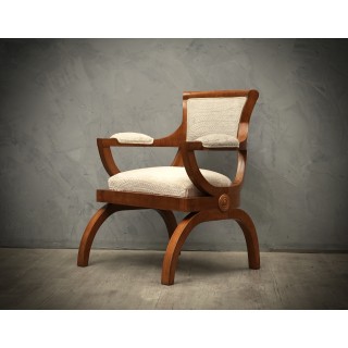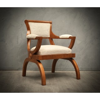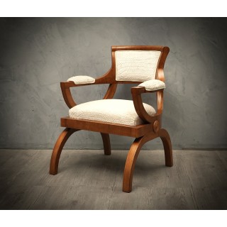 Poltrona dal design particolare e pregiato legno di ciliegio, il tutto rifinito con un bellissimo tessuto in velluto bianco impunturato.