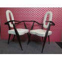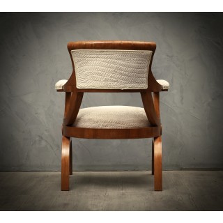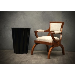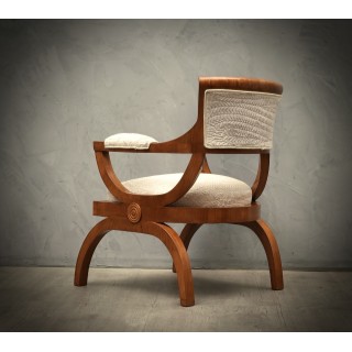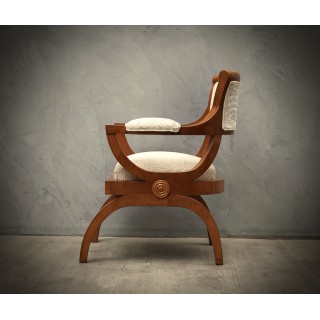 All veneered in cherrywood and covered with a white embroidered velvet fabric. The design of the chair is very particular and up-to-date. The seat of the chair is straight on the front and rounded on the back. Even the backrest, with a great support for the back, follows the curve of the seat. The backrest frame is in cherrywood and inside it is covered in embroidered white velvet. The two small arms follow the line of the legs, curved but flat in the part of the support of the arm, where it has a velvet covering. Two wooden rims allow support on the ground. Original design. The fabric is coming from the "silk factories of zoagli". Misure. Cm (60 x 50, H 71). Inches ( 23.64 x 19.7, H 27.97).