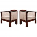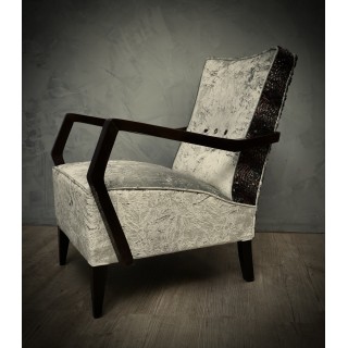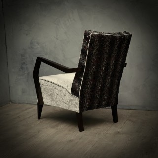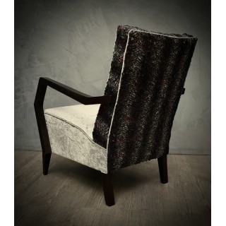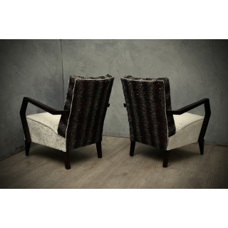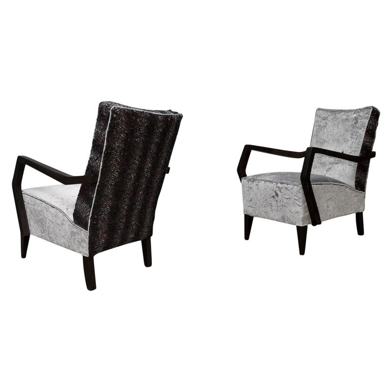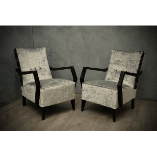 Tutte ricoperte con due tipi di velluto combinato. Per la parte posteriore dello schienale è stato utilizzato un velluto sgualcito grigio chiaro mentre per la seduta e la parte anteriore dello schienale ne è stato usato uno in velluto grigio e viola con paillettes incollate. I braccioli sono realizzati in legno di faggio tinto in mogano scuro, che sono fissati alla poltrona mediante viti. Le due poltrone sono sollevate da terra mediante le gambe in faggio, dello stesso colore dei braccioli. Cm ( 60 x 78, H 82 ). Inches ( 24 x 31, H 32 ).