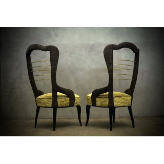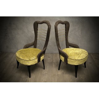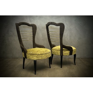 Wooden frame completely covered in velvet. Seat covered with a green striped velvet with silver inserts. Backrest covered with a dark gray velvet. Polished brass inserts are placed in the center. The armchairs are raised from the ground by four legs in beech wood, polished in black shellac. Misure Cm ( 53 x 61, H 90/39). Inches ( 21 x 24, H 35/15).
