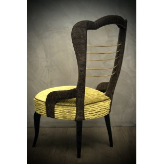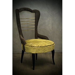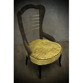 Struttura in legno completamente rivestita in velluto. Seduta rivestita in velluto a righe verdi con inserti argento. Schienale rivestito in velluto grigio scuro. Al centro sono posizionati degli inserti in ottone lucido. Le poltrone sono rialzate da terra da quattro gambe in legno di faggio, lucidato in gommalacca nera. Misure Cm ( 53 x 61, H 90/39). Inches ( 21 x 24, H 35/15).