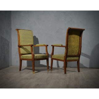 Royal pair of armchairs all in walnut wood and green velvet, classic and unmistakable design.
