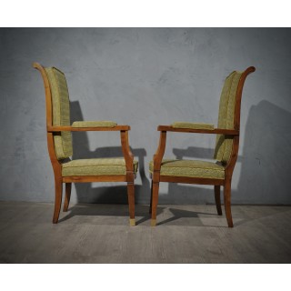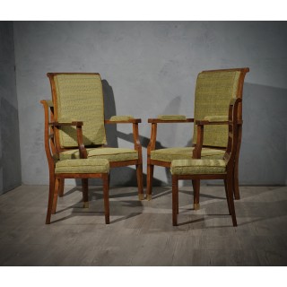 The armchairs are all in walnut, and have a. very classic design with a large and present curved backrest padded with green velvet fabric with geometric designs. They also have two large seats always covered with green velvet; on the sides there are two beautiful armrests also with a small lining in the central part. The front legs have two brass cups in the final part.Very classic and linear chairs offer a very welcoming seat well padded with a splendid green velvet fabric with geometric designs. The color is very warm and the wood has a beautiful patina. Misure Cm ( 58 x 63, H 114/44). Inches ( 23 x 25, H 45/17).
