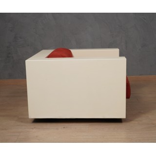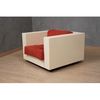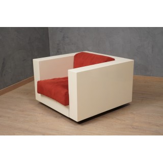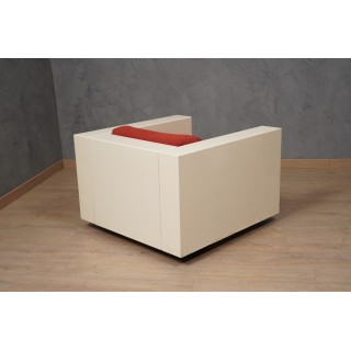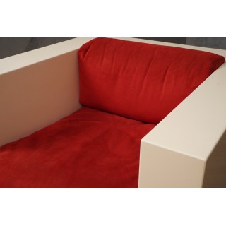 The armchair is made up of a series of modules in white lacquered wood, with cushions in red fabric. Studied down to the smallest detail, its design is linear and simple but perfectly and comfortably accommodates a person's seat. Misure ( 90 x 90, H 60/40 ) Inches ( 35 x 35, H 24/16 ).