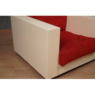 La poltrona è composta da una serie di moduli in legno laccato bianco uniti insieme, con cuscini in tessuto rosso. Studiato nei minimi dettagli, il suo design è lineare e semplice ma accoglie perfettamente e comodamente la seduta di una persona. Misure ( 90 x 90, H 60/40 ) Inches ( 35 x 35, H 24/16 ).