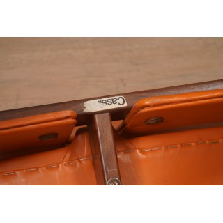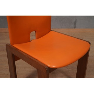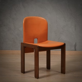 The chairs are made of walnut wood, and have a very simple structure, a double trestle, can be seen from the photos. The seat covered in warm orange leather was positioned above the wooden structure, and the backrest was also covered in warm orange leather; both designed and made very thin like two rose petals, to comfortably accommodate the person sitting, but at the same time rigid and resistant to torsion. Special screws specifically designed by the designers were used to anchor the seat and backrest to the wooden structure. The 121 model is a chair born as a dining chair combined with the 778 extendable table, a chair which however is also suitable for a meeting room table.