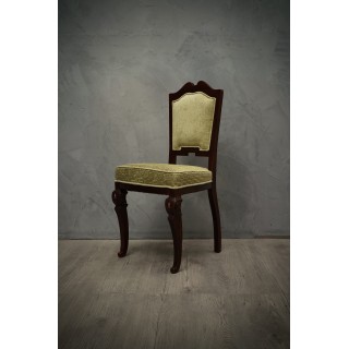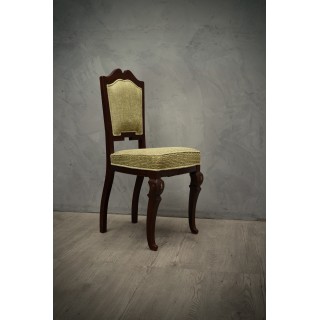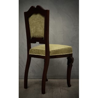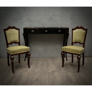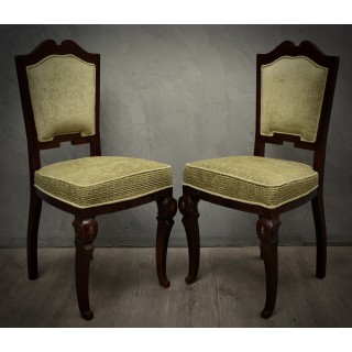The chairs are all in mahogany, and have a very articulated structure. Rectangular seat, which tightens towards the backrest. The front legs, what gives character to the chair, have a saber design with a small inlay on the front at the top. The backrest is worked, and has a heart-shaped curve in the upper part. The seat was covered with a green fabric in geometric velvet; while on the backrest, a smooth green velvet was combined. Misure Cm ( 45 x 42, H 95/49 ). Inches ( 18 x 16, H 37/19 ).