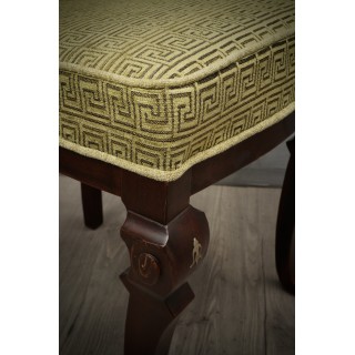 Le sedie sono tutte in mogano, e hanno una struttura molto articolata. Seduta rettangolare, che si stringe verso lo schienale. Le gambe anteriori, ciò che dà carattere alla sedia, hanno un design a sciabola con un piccolo intarsio sul davanti in alto. Lo schienale è lavorato, e presenta nella parte superiore una curva a forma di cuore. La seduta era rivestita con un tessuto verde in velluto geometrico. Misure Cm ( 45 x 42, H 95/49 ). Inches ( 18 x 16, H 37/19 ).
