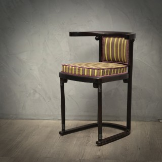 La coppia di sedie è interamente in faggio curvato, con particolare attenzione ai dettagli come le piccole sfere posizionate sotto la seduta in prossimità dell'attacco delle gambe. Schienale curvo che prosegue e dà forma ai braccioli. Il tessuto utilizzato per il nuovo rivestimento è un velluto rigato, molto bello il suo abbinamento con il colore del legno. Misure Cm ( 42 x 45, H 75/53 ). Inches ( 16 x 18, H 29/21 ).