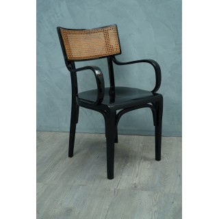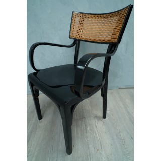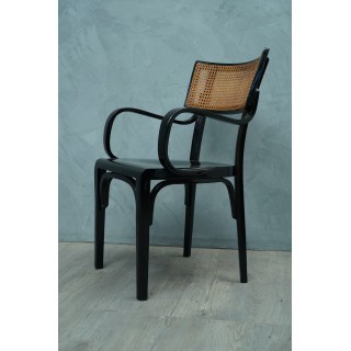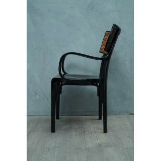 La sedia ha una struttura in legno di faggio, con gambe dritte e lineari, mentre i braccioli sono curvati a caldo, come era consuetudine nella tecnica dell'epoca. La seduta è in legno, mentre lo schienale piccolo ha una struttura in legno dove al centro è posta la paglia di Vienna. Misure Cm ( 54 x 48, H 88/47 ). Inches ( 21 x 19, H 35/18 ).