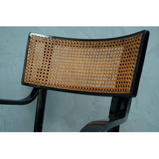 The chair has a structure in beech wood, with straight and linear legs, while the armrests are hot-curved, as was usual in the technique of the time. The seat is in wood, while the small backrest has a wooden frame where the Vienna straw is placed in the center. Misure Cm ( 54 x 48, H 88/47 ). Inches ( 21 x 19, H 35/18 ).