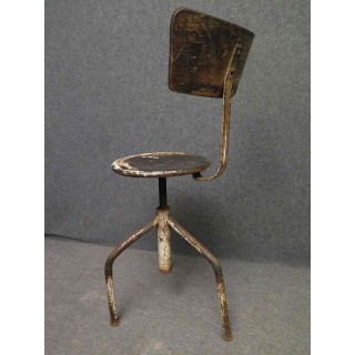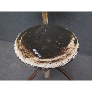 Tutto in metallo laccato bianco consumato dal tempo. Il sedile è girevole e può essere alzato e abbassato a seconda delle esigenze. Ha tre piedi piegati che si uniscono nel mezzo; qui sono saldati ad un tubo che contiene la grossa vite che fa alzare e abbassare lo sgabello. La grossa vite è ancorata al sedile. La seduta è formata da una piastra metallica, da cui parte una fascia metallica che poi forma un piccolo schienale. La fascia dello schienale è realizzata in legno bianco consumato ed è fissata alla fascia metallica con due bottoni in metallo. Misure Cm ( 35 x 35, H 80/45 ). Inches ( 14 x 14, H 31/17 ).